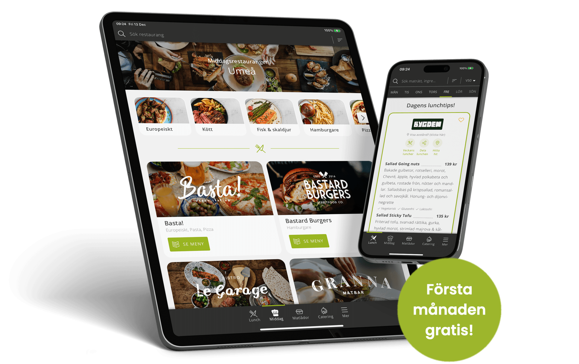 På våran restaurang- och lunchguide kan du visa upp alla dina menyer, vare sig du serverar lunch, middag, matlådor, catering. Eller allt samtidigt! Du får ett samlat ställe att lägga upp och marknadsföra din restaurang och kan till och med visa menyerna automatiskt på din hemsida. Samlat, enkelt och smidigt. Du väljer vad som passar din restaurang.